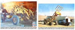 "We started with a 4-WD surplus government snowplow made in the 1940's or early 50's. We stripped it down to the frame, getting rid of all power train components except for the rear ends. Next, we bought a junked Case 1000D crawler tractor for the loader and mounted it on the truck frame with the steering axle at the rear. We had to cut the truck frame to lower it down to mount directly on the axle so the loader would be the right distance from the ground. We installed a big transfer case from another 4-WD truck and shortened up the wheelbase to make the machine as maneuverable as possible. The shortest we could go was 9 ft. because of the large differentials and transfer case. If possible, it would be better to shorten it up to 8 ft.