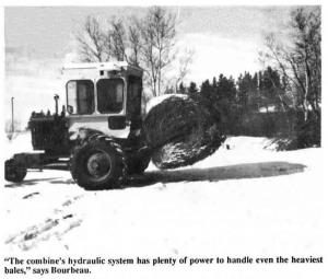 Bourbeau removed the combine's header and lowered the engine's frame by 2 ft. He replaced the existing steering box with a larger one off a 1969 Chevrolet school bus because the old one was not responsive enough for the bale handler. To handle bales, he welded a 6-ft. length of 3-in. sq. steel tubing across the feederhouse and mounted a pair of hinged aims on it that he built from 3-in. sq. steel tubing. The header lift cylinder is used to raise and lower the arms while a 2-in. dia. cylinder is used to open and close them.