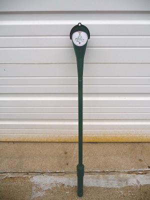 The bottom of the pipe has a small hole in it. The floating balls push up on a long wooden rod that comes up through the pipe and into the center of the funnel. Easter placed a piece of white tape at the top of the funnel and marked it where the top of the rod should be when the tree stand is full of water.