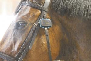 The waterproof device attaches to a horse’s halter, bridle or chest strap and can be worn during training, transportation or whenever you wish to monitor your horse outside or in a stall.