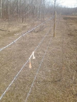 With raw bacon hanging every 100 yards or so, hungry predators are eager to grab a strip. When they do, they get a powerful shock. Calf yards are near the farmyard with AC outlets for a more powerful fencer. Last year he used 3-strand barbed wire with 2 hot wires and a ground. If the predators tried to go through, they were guaranteed a good shock. Simply sniffing the bacon was just about as effective.