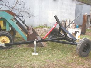 The triangular spear base is about 3 1/2 ft. to a side with a center post of 2 by 3-in. steel tubing and angle iron sides. The spear base is hinged to the axle. A hydraulic cylinder is pinned between ears welded to the tongue and the center post of the spear base. It pushes the spears into a horizontal position for spearing the bale and then pulls them back to about a 45-degree angle to carry the bale.