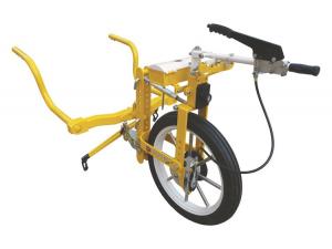 The operator walking alongside can activate the brake lever, which can be offset to either side. The same lever can be used to manually steer the front wheel if desired.
