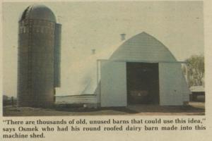 New Life For Old Barn LIVESTOCK Buildings 8-4-16 "Now we've got a building we can use. It makes a great machine shed," says Leo Osmek, Glencoe, Minn., who brought his round-roofed dairy barn down a notch, cutting about 6 ft. out of the sides and remounting it on the old foundation.