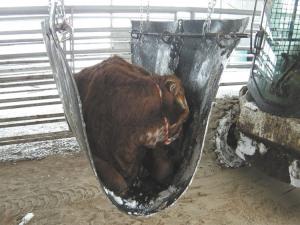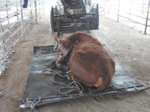 Dale Goetz came up with the basic design at the request of a research center. The 6 by 8-ft. piece of 1/2-in. thick rubber sheet is supported by metal rods, D-rings, and stainless steel bolts. When an animal goes down, it can be rolled onto the rubber sheet and then pulled with a chain like a sled. Or it can be lifted like a sling and moved with a loader.