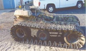 James Bassett, Berlin, Md., turned an early 1990s Yazoo zero-turn riding mower into a camouflaged marsh buggy that rides on tracks and can motor through the marshland on his property.