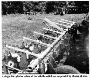 A new lift system for cultivators lets you raise and lower all cultivator shields at once from the tractor seat.