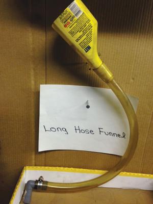 Ron Paustian, Eau Claire, Mich.: “I put together this long hose funnel to pour oil into hard-to-reach vehicle transmissions. I cut the bottom off a 1-pint plastic fuel additive container and turned it upside down, then friction-fitted one end of a transparent hose to it. A 90-degree pvc elbow is clamped onto the other end of the hose and reaches into the transmission. I used a heat gun to heat up the hose so that it would stretch and fit over the funnel. Once the hose cools down it locks itself on.”