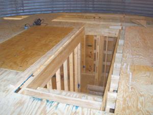 Construction started by laying out concrete blocks for the polygon’s footings. A sill plate was laid on the block and conventional floor joists laid over that. The raised floor created a crawl space for a utility entrance and drain exit.