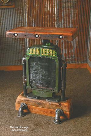 Tables Made From Old Radiators FARM HOME Furniture Shawn Carling had no idea that the special lamp he made for his father a few years back from old tractor parts and pipe would grow into a thriving business Vol 38 No 3 Flip the calendar ahead almost 4 years and Carling’s Lakeville Minn company Machine Age Lamps now has an international reputation for hand-made products every one of them custom-built and truly unique “Since we started we’ve made well over 1 000 lamps tables and other items ” says Carling “We’ve moved to a new shop and that’s quickly filling to capacity with rusty treasures waiting to be made into lamps tables sconces and anything else we can dream up ” Recently Carling and his crew tapped into a new concept when they began building rugged tables that use old tractor radiators and thick pieces of reclaimed lumber on the top The metal and wood is preserved and finished so a company brand name or logo can appear in a rich natural tone Carling says he acquires most of his tractor and machine parts from a fellow who repairs and refurbishes old equipment but often has many leftover parts Carling also is on the lookout for parts when he and his family are on vacation running errands or even when they’re at shows Products from Machine Age Lamps have made their way into homes and businesses across the U S and around the world Contact: FARM SHOW Followup Shawn Carling Machine Age Lamps Lakeville Minn ph 612 804-2247; www machineagelamps com