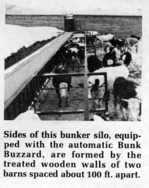 Pachta installed the system last December in his newly-built 40 by 90 ft. bunker silo. He figures his total investment in the automatic, push-button system is about a third of what it would have cost for a comparable size feeding operation built around upright silos. He spent $1500 for materials (treated plywood walls and a poured concrete floor) used in building the bunker silo. Retail cost of the automatic "Bunk Buzzard" unloader is about $10,000.