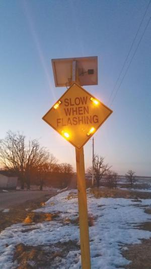 A new warning system lets drivers know a slow moving vehicle, person or animal is just over the hill. When the solar-powered interactive sign senses anything moving past it at less than a preset speed, it will flash for 3 min. The sign warns faster drivers to slow when it is flashing.
