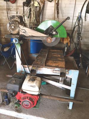 “I bought an old tile cutting saw with stand at an auction for $20 and converted it to a portable steel-cutting chopsaw. The saw’s electric motor didn’t work so I replaced it with a Honda 9 hp gas engine. I also installed a new driveshaft and replaced the saw’s belts and pulleys to fit.