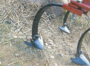 State-Of-The-Art Walk-Behind Cultivator CULTIVATORS “I tried using a couple of different commercial walk-behind cultivators to break ground for my garden but the tines were spaced too close together and plugged up on sod clumps weeds and roots So I finally decided to build my own walk-behind cultivator that won’t plug up ” says Perry Gingerich Wadena Minn His cultivator covers a full 15-in working width and has 3 rows of shanks with 3 1/4-in wide shovels welded onto them There are 2 shanks on the front and back rows spaced 10 in apart and one shank in the middle All shanks bolt onto a rectangular flat iron frame that’s bolted to a short length of square tubing “Most walk-behind cultivators have narrower shovels with about a 1 1/2-in gap between them that never gets touched The shovels on my cultivator are tapered and lay flatter with the ground so there’s no gap between them ” says Gingerich The cultivator rides on a single wheel on front and has wooden handles with a pipe connecting them on back “The design lets you push against the pipe with your stomach and your whole body whereas with other walk-behind cultivators you have to push everything with your wrists and shoulders which is harder to do ” says Gingerich But he says the cultivator’s best feature is that it has built-in “weed pullers” - a pair of V-shaped slots notched into each side of the point “If the weeds just bend out of the way as I move forward without coming out of the ground I can back up and the V-notch on either side of the shovel will catch them and pull them out ” says Gingerich “Sometimes the notch just cuts through the weed’s root but other times it catches on the root and pulls it right out of the ground I’ve had very good results with it “I used my cultivator last year for the first time and had very few problems with plugging and very few weeds that I couldn’t pull out ” By pulling a pin Gingerich can remove all the shovels and attach a 2-row marker which he can adjust anywhere from 18 to 36 in wide He also built a row marker attachment with 2 shovels on it It installs by unbolting the frame that holds the shanks and shovels from the square tubing and bolting the frame of the row marker attachment in its place “I’m thinking about making more attachments for my cultivator including a pony hitch but I don’t have anything on paper yet ” says Gingerich who notes that he’s willing to build the cultivator for others and can make it with 4 shovels instead of 5 The 5-tine model sells for $170 and the 4-shovel for $160 The row marker sells for $25 and the pony hitch for $12 All prices are postage paid Contact: FARM SHOW Followup Perry Gingerich JR’s Sandblassting and Painting 30225 610th Ave Wadena Minn 56482