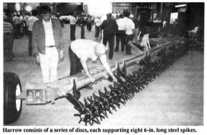The harrow consists of a series of discs each with eight 6-in. long steel spikes ex-tending from them. Each set of teeth is mounted on steel plates and mounted on a steel shaft. Depth is controlled by hydraulic cylinders which also fold the harrow back-ward for transport.