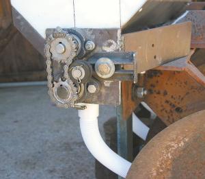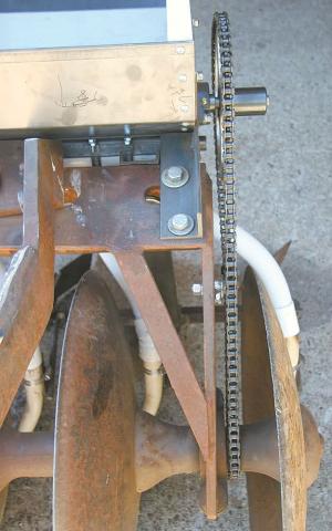 “I turned down one of the disc blade spacers to accept a small sprocket,” explains Spurlock. “A chain runs from it to a large sprocket on the agitator shaft. A chain drive between matching sprockets on the 2 shafts is mounted on the opposite end of the hopper to drive the metering shaft.”