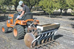 Individual angled plates on hinged arms are mounted to the same frame. They float over the ground, covering the seed with dirt loosened by the discs. After seeding the orchard, Spurlock pulls a ring roller over the orchard to pack the seeds in.