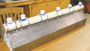 Spurlock made manifolds out of three 2 1/2-in. pvc couplers. These carry the seed from the metering pipe to the tubes that run down to the planting nozzles. He cut 1-in. opposing holes in the center of each coupler, inserted 1-in. pvc couplers in the holes and glued them in place.