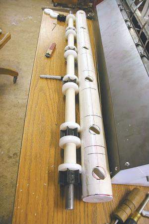“I cut the discs out with a hole saw and then turned them for a light-press fit inside the pipe,” says Spurlock. “I center drilled them for a free fit on the 7/8-in. shaft. They sit stationary inside the pipe and serve as bearings for the shaft, with the end discs fixed to the pvc pipe with screws to hold the shaft in place lengthwise.”