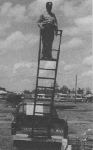 When mounted on his tractor's 3-pt., the ladder has a maximum working height of 15 1/2 ft. He can vary the height by adjusting the 3-pt. arms.