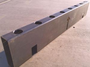 The operator holds the template down by driving a pair of hold-in-place pipes through corresponding rectangular slots on both sides of the template. Then he inserts the fence pipes through the top of the template and pounds them 3 ft. into the ground to start the fence. After driving all the pipes into the template, he removes the hold-in-place pipes and slides the template up and off the pipes. He then moves the template over and slides it down over the last 4 pipes, which leaves the template with 4 empty holes to insert more pipes. He repeats the process until the fence extends all the way across the creek.