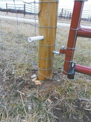 One thing he noticed was that the plastic on store-bought electric fence terminals would become brittle from being out in the sun. He needed a stronger terminal that had more length than traditional 2-in. store-bought screw-in insulator terminals, since he also had a problem with the pigs pushing the electric wire up against his hard fencing and gates, which caused the fence to short out. PVC turned out to be the answer. Caleb used thick walled ½-in. pvc pipe cut into 7-in. lengths; 2 in. of the length of pvc fits into pre-drilled holes in the wooden gate posts and is secured by 1 ½-in. screws going through the pipe into the wood at an angle, and the remaining 5 in. comes out of the posts. Holes were drilled into the exposed end of the pvc to run the electric wire through.