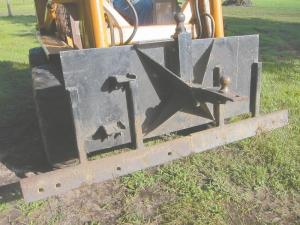 He uses the quick-tach plate on his Case 1835B skid loader. The plate is equipped with a 2-in. ball hitch plate, a drawbar pin hitch, a gooseneck hitch, and a 6-ft. long, 5-in. high grader blade. The grader blade, located about 2 in. below the plate, is welded to 4 vertical lengths of 1 1/4-in. square tubing welded onto the plate.