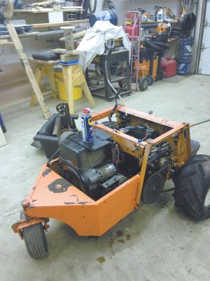 Wheelbarrow Powered By Zero-Turn Mower FARM HOME Lawn Mowers 31h 38 Pushing a loaded wheelbarrow around is hard work especially when you’re using it to haul wet concrete mix John Houston says his self-propelled wheelbarrow made out of an old zero-turn riding mower does most of the work for him It even dumps its load automatically “I built it to use with my concrete mixer but it can also be used for many other jobs ” says Houston “The wheelbarrow extends about 4 ft in front of the mower I drive the wheelbarrow under the concrete mixer’s spout and load it up then drive to the site of the building foundation and dump it It has no trouble moving 300-lb loads unless the ground is real muddy ” He bought the used Woods zero-turn mower on Craigslist for $800 He removed the deck and the pto shaft that belt-drives the blades He removed the wheelbarrow’s handlebars and built a metal support frame that attaches to the wheelbarrow’s axle and also to a rectangular steel frame that attaches to the mower “I left a couple of stub shafts on front of the mower and welded a length of 1-in dia tubing onto them The tubing serves as a pivot point for the frame allowing the wheelbarrow to float up or down on uneven ground ” explains Houston The wheelbarrow is raised or lowered by a 12-volt DC actuator rated at 2 000 lbs It operates off the mower’s battery and is activated by pressing a switch on the mower Contact: FARM SHOW Followup John Houston 3821 Patuxent River Rd Davidsonville Md 21035 ph 301 370-4890; jhouston@singletonelectric com