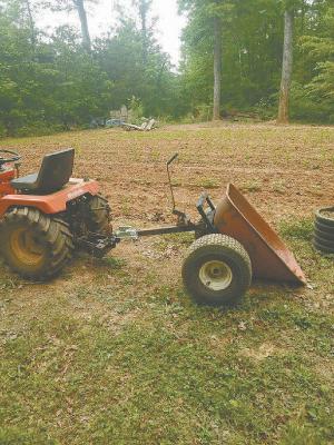 Wheelbarrow Dump Trailer FARM HOME Miscellaneous “I use it to haul mulched leaves rocks and dirt firewood and other materials It’s handy to use - I just reach back and pull a trip lever to dump it ” says James Henson Union Mills N C who converted an old wheelbarrow into a handy 2-wheeled dump trailer He tows it behind his Simplicity garden tractor Henson already had the wheelbarrow which is an industrial model with a deep bucket He built a frame and tongue out of some old steel tubing and tach-welded a ball hitch off an old 4-wheeler to the tongue The dump bed rides on 12-in tires off an old riding mower and has an axle made out of 3/4-in round stock and square tubing The bucket is hinged at the bottom A 1/4-in thick horizontal metal strap that’s free to pivot is welded to the trip lever and is beveled at one end which rests on a small metal tab welded to the frame The main part of the strap rides on a 6-in long compression spring that’s welded to the tongue Pulling the trip lever forward compresses the spring and causes the strap to pull away from the frame which causes the bucket to dump When Henson lets go of the lever the bucket drops back down and the strap automatically resets itself “It works really good I use the tractor’s hitch to raise the tongue 8 to 12 in off the ground which causes the frame to tilt down toward the back and completely empty the bucket ” says Henson “Once the load has been dumped I lower the hitch which causes the bucket to slam back down “I used a 3/8-in dia metal rod to make the trip lever and the 6-in long spring off an old trampoline to form the handle The spring is shaped like a handle and has a comfortable feel ” Henson uses an early 1980’s Allis Chalmers Simplicity garden tractor to pull the dump bed “This tractor is quite rare and has a posi-traction rear end so both wheels always pull at the same time ” notes Henson Contact: FARM SHOW Followup James Henson 2617 Rock Road Union Mills N C 28167 ph 828 748-5633; doehenson1@gmail com