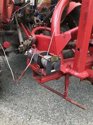Cornett bought a 2,500-lb. winch and welded it onto a steel plate that he bolted to the left side of the mower. He welded a 5-ft. length of 2-in. square tubing to the same plate, then drilled a 1/2-in. dia. hole in the top of the tubing and bolted on a 3-in. pulley. After cutting up a 3-in. chain link he welded it on back of the sicklebar, about 2 ft. from the end. A chain hook on the winch cable attaches to the link.