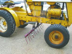 “I recently mid-mounted a 40-in. dethatching rake on the tractor that helps prepare ground for spring reseeding of dead grass areas in our lawn. I was able to use the arms and lift lever from the old mower deck lift. Eight spring teeth, originally intended for pickup use on a baler, are mounted on a piece of 3/4-in. ID pipe. It really works well and is another way to put our Cub Cadet to use.”