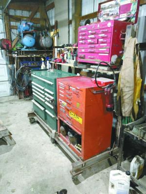I had some 4-in. by 3/16-in. I-beam for the frame and put 6 wheels underneath. The middle ones are stationary and have 1/8-in. shims to make them a little longer. So you get a little wobble, but it allows you to pull on either end and turn it pretty freely, Bengtson says. He used heavy-duty, rubber-coated 4-in. caster wheels to support the weight of the frame and tool boxes.