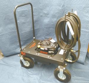 The 4-wheeled machine rides on 10-in. pneumatic tires and is about the size of a red wagon. The cart comes with a big, adjustable U-shaped handle on one end and a hose rack on the other.