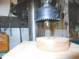 “Every time I drilled a hole I had to use a screwdriver to pry the wood out. So I used JB Weld to attach a spring on the arbor inside the hole saw. Now every time I release the pressure on the drill press, the spring automatically pushes the wooden spool out,” says Symynuk.