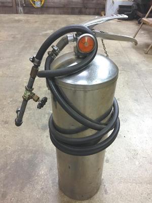 Fire Extinguisher Used To Add Gear Oil To Gearboxes FARM SHOP Miscellaneous Jon Arms Brewster Mass : “I use a surplus fire extinguisher to add gear oil to gearboxes I fitted it with a pressure hose and a 1/4-in nip valve It holds about 2 gal of oil added through the top nut that holds the handle and dip tube Air is added through the snifter valve at the top beside the pressure gauge “It sure makes life easier when filling transmissions or differentials I use a round key ring on a chain to hold the handle in the flow position I have two of them one used for gear oil and the other for hydraulic oil When I was 15 and worked at a gas station they had a large floor-mounted gear oil machine I just downsized the idea to extinguisher size Very convenient for a small shop ”
