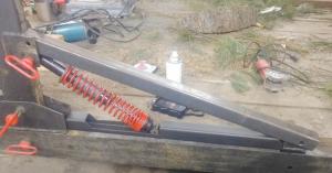 Each bracket top consists of a set of steel plates welded at the rear and drilled to create a pivot point for the arch. A piece of steel tubing welded to the plate ahead of the pivot point was opened up to create a short open track for the end of a spring shock to ride in. The other end of the shock is pinned to a bracket on the front side of the arch. A retainer made from steel channel iron also pins to the arch bracket, as well as to the forward end of the bed bracket. When pinned, it locks the arch in vertical position for transport.