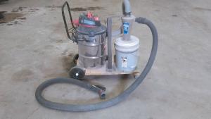 A vacuum hose is connected to the outlet of the dust separator and the inlet of the shop vac. A pickup hose was mounted to the inlet of the dust separator.
