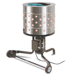 The chicken plucker rides on 2 solid rubber wheels and is operated by a 1 1/2 hp. electric motor. It comes with 110 replaceable rubber fingers mounted inside a removable stainless steel tub. The fingers pluck the feathers while washing dirt from the skin. A small round discharge chute at the bottom of the bucket deposits feathers into a bucket.