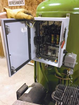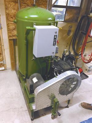 To produce dry air and keep moisture from collecting in the pressure tank, Rinke mounted an aftermarket air exhanger on the side of the compressor skid with an electric power fan cnclosed in a metal shroud.