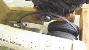 “The front end of the scooter came from a bicycle and he mounted a bicycle seat on the frame. The engine was fitted with a 2 1/2-in. pulley that belt-drives the rear wheels. “The rear wheels are mounted right up next to each other so that the belt rides between them. The scooter has a small pedal that you push to tighten the belt via a wire that runs to a small idler pulley. Another pedal connects to a wire that runs back to a board that pushes against the rear wheels to brake,” says Yoder.
