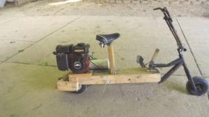 The scooter cruises at a top speed of 20 mph, fitted with small 9-in. wheels. A pvc pipe fitted with a removable cap serves as a toolbox. Total cost of the scooter? Just $35.