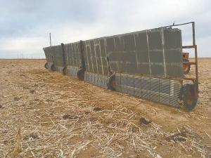 Gary Barker, Pratt, Kan., built a portable windbreak on the frame of a 60-ft. wide, 5-section Noble Crustbuster field cultivator. He uses it in harvested grain sorghum and milo fields where his cattle graze temporarily and tows it behind his tractor from field to field. The tractor stays hitched to the windbreak at all