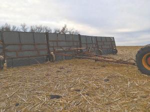 Field Cultivator Converted To Portable Windbreak CULTIVATORS Gary Barker Pratt Kansas built a portable windbreak on the frame of a 60-ft wide 5-section Noble Crustbuster field cultivator He uses it in harvested grain sorghum and milo fields where his cattle graze temporarily and tows it behind his tractor from field to field The tractor stays hitched to the windbreak at all times to keep high winds from tipping the windbreak over “It rides on wheels and folds up to only about 15 ft wide as we drive it down the road from one field to another ” says Barker The cultivator came with a 14-ft wide center section and a 23-ft wide wing on each side which fold behind the center when in transport Barker unbolted all the cultivator shanks and then bolted a metal framework on top of the cultivator frame to make it 8 ft tall He then cut the corrugated tin sheets in pieces about 8 ft high and bolted them on There’s an 8-in wide gap between the sections where they hinge together Barker filled the gaps in with lengths of rubber inner tubing He installed hinges on the bottom part of the cultivator frame and used metal pins to attach the tin sections to them “When I want to drive on the road I pull out the pins and then fold the bottom tin sections up out of the way When I get to the next field I fold them back down again They end up just a couple inches off the ground ” Barker parks the windbreak out in the open for a week or two at a time before moving it to the next field “If the wind shifts directions we can easily start the tractor and reposition it ” explains Barker Barker also converted another 60-ft field cultivator into a windbreak and has a couple others that he may convert in the future “My dad was a shortline dealer years ago and sold hundreds of these cultivators until farmers started using heavier cultivators that could dig deeper ” notes Barker Contact: FARM SHOW Followup Gary Barker 10400 S E 60th Ave Pratt Kansas 67124 ph 620 770-1227; ruthannbarker@yahoo com