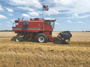 “We run the machine every year harvesting a hundred or so acres of beans or wheat with the 17 1/2-ft. head, and it still does a great job,” says Matt. “Over the years it has always been our second machine, so it’s semi-retired and now has about 4,250 hrs. on the meter. Initially we put bigger tires on it, but those have been replaced with the original size. We’ve done some work with the hydrostatic drive and keep everything in good working condition. The machine has never had one hour of downtime. The engine and drive train are still original,” Matt says.