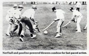 The new game - there's even an official rulebook - is played with hand-held power blowers by two teams that try to blow a 7-in, nerf ball from one end of a 60 by 100-ft. playing field to the other.