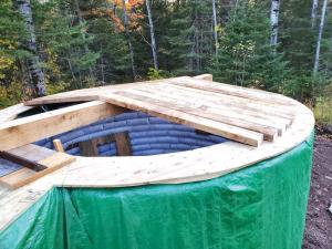 A loader tractor was used to cover the entire structure with dirt. The root cellar - which can also be used as a storm shelter - spreads out to about 30 ft. at the base with about 6 to 10 in. of soil on the top. Jute and straw covered it the first winter, but the goal is to sow a cover crop on the mound this year. Also, the tarp in front of the door will be replaced with a second door to create a buffered entry.