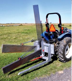 The carry and cut attachment comes with either a skid loader or 3-pt. hitch mount. The knife is 3 in. thick at the spine with a 10-in. wide blade. A 72-in. long, 1 1/2-in. dia. ram drives the blade through a 90-degree arc for a full cut through the bale.
