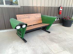 Bultman’s fender bench now rests in front of the office and shop on the re-built farm site.