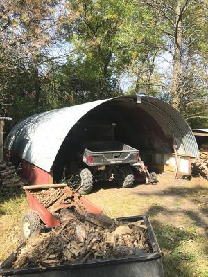 They store firewood in one hoop building, which has an aluminum door at one end, with an attached metal screen to protect it from falling wood. “We fill 3/4 of the building with firewood and park the log splitter in the remaining space,” says Jack.