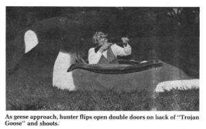 Stan Carlson, Anoka, Minn., invented the "Trojan Goose" which is made from lightweight fiberglass. It's big enough to contain a low-lying chair in which the hunter reclines while waiting for geese, watching the sky through a hole in the back of the decoy's neck. When geese come in, attracted by the huge decoy, the hunter quickly flips open the double doors on the back of the decoy and shoots.
